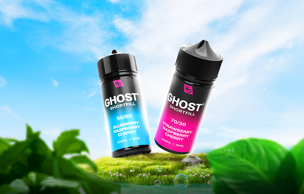 GHOST® Shortfills 100ml Strawberry Raspberry Cherry offers juicy strawberry flavour blended with raspberry and cherry for a richer berry mix, delivered as a nicotine-free 100ml e-liquid with both 70/30 (bigger clouds) and 50/50 (balanced draw) options.